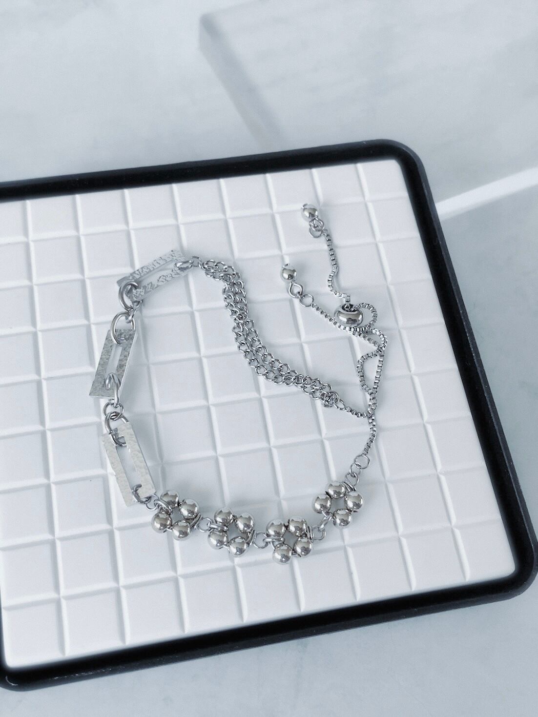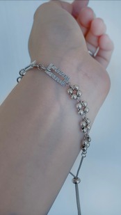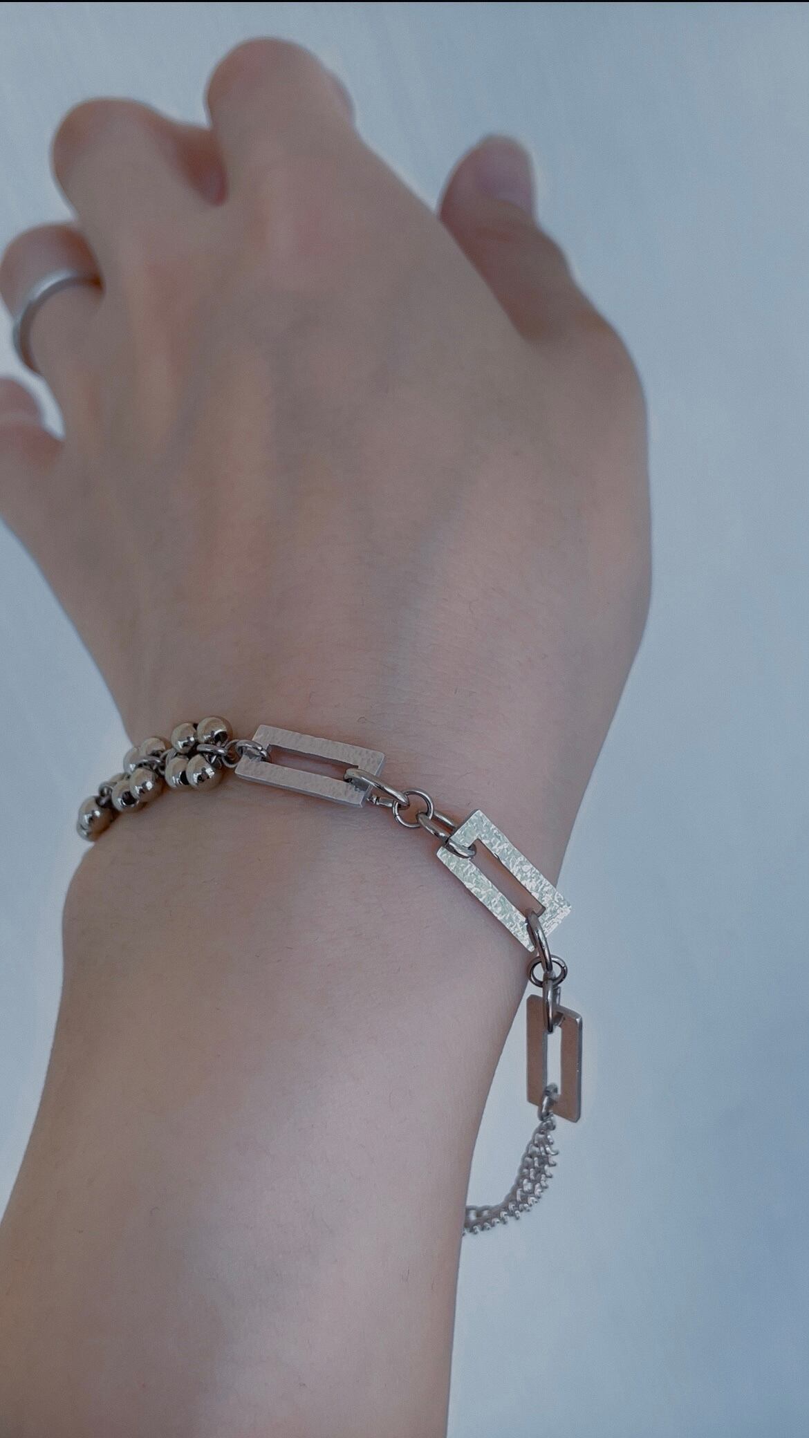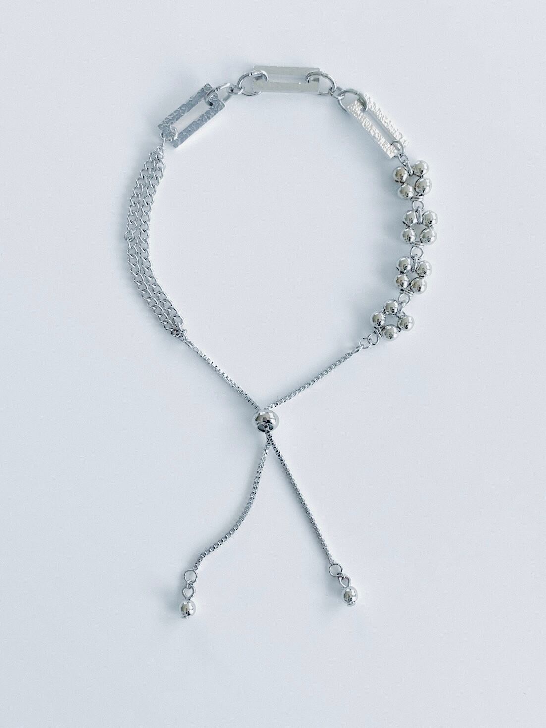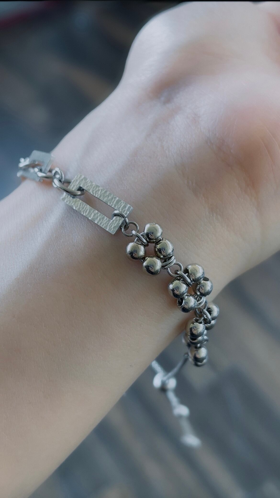 輝き方の異なる個性的なパーツを組み合わせたクールなブレスレット。